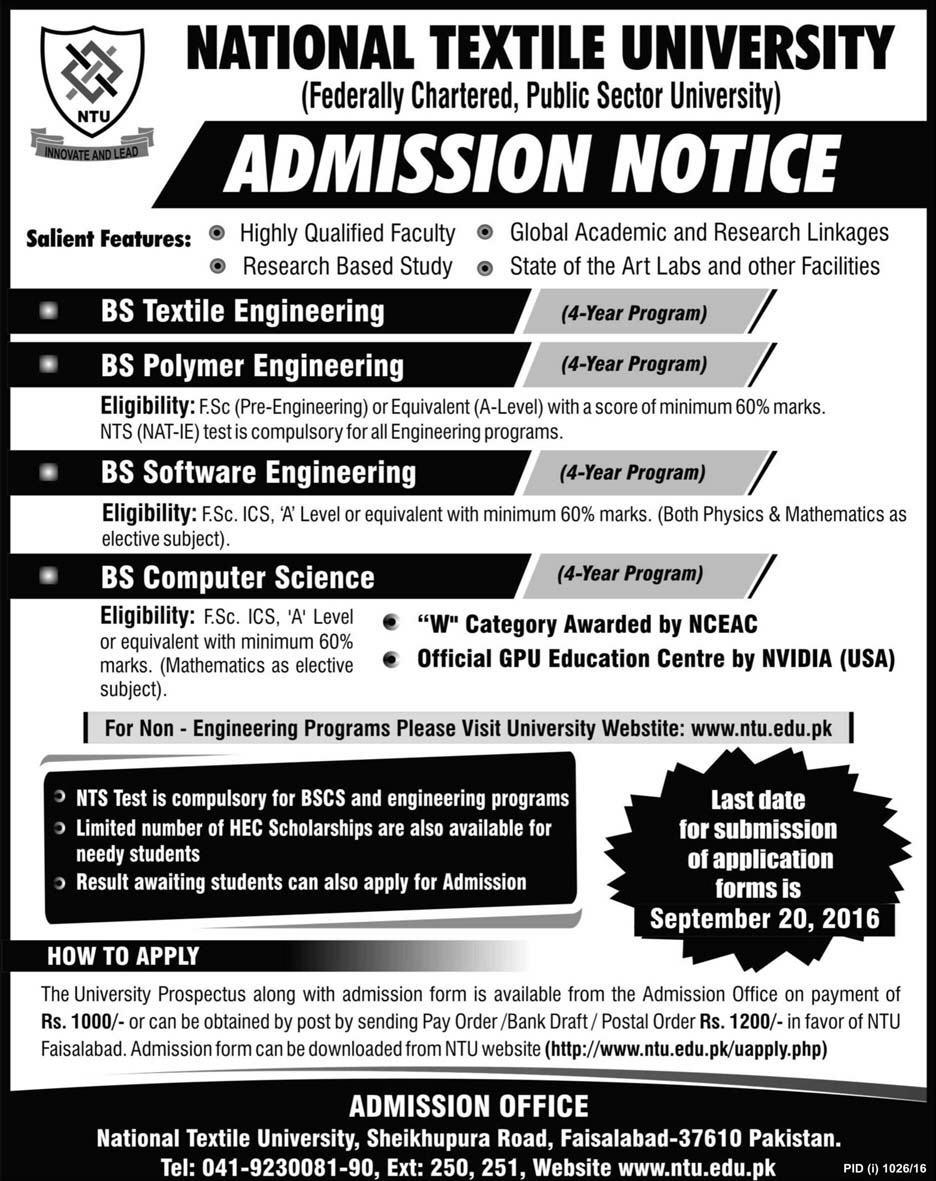 HomeuniversityNational Textile University Admission 2016-17 Last Date National Textile University Admission 2016-17 Last Date Sami Aslam National Textile University Admission 2016-17 Last Date 20th September 2016. Tags admissions university Newer Older